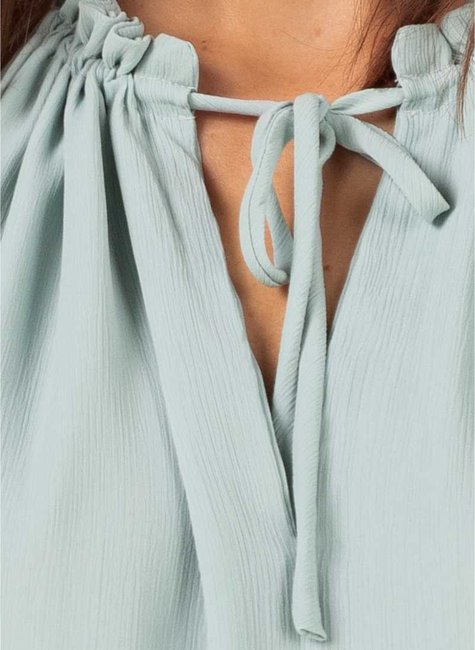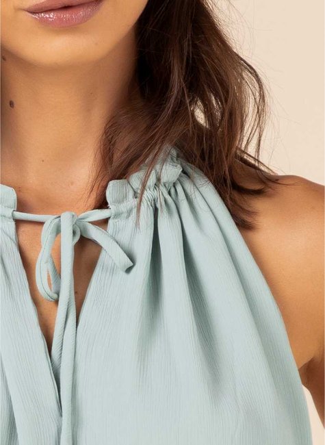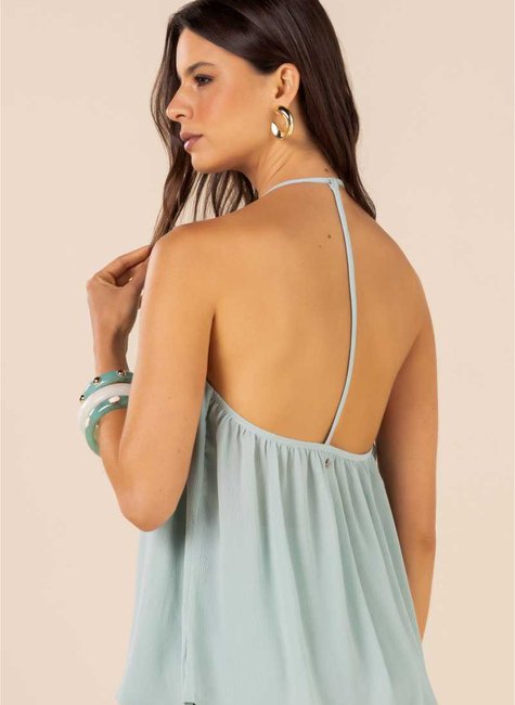 O destaque fica por conta da amarração no pescoço, que cria um decote em V sutil e adiciona um toque moderno à peça. O franzido leve na gola reforça o ar delicado e sofisticado. Nas costas, o charme é garantido: o modelo possui costas parcialmente nuas, com cordão que forma um “T” nas amarrações traseiras, resultando em um visual elegante e diferenciado.
