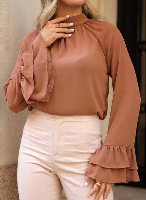 A Blusa Essência Leve é uma escolha elegante e leve para quem busca sofisticação com um toque de feminilidade. Seu design traz uma combinação harmoniosa entre o clássico e o contemporâneo, com destaque para a gola suave que adiciona charme ao colo e o babado sutil no punho, que valoriza os movimentos com delicadeza.