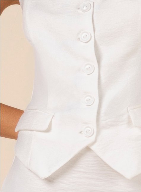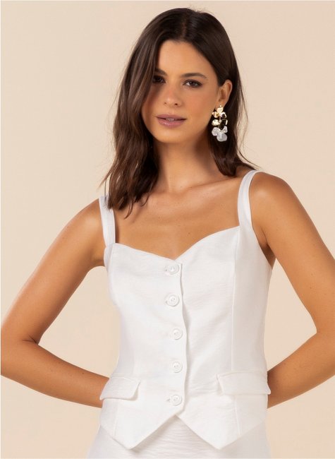 O modelo conta com fechamento por botões frontais, que adicionam charme e praticidade ao vestir. As alças largas oferecem melhor sustentação e conforto, enquanto a barra com recorte simétrico confere um acabamento diferenciado e atual à peça, reforçando sua proposta estruturada.
