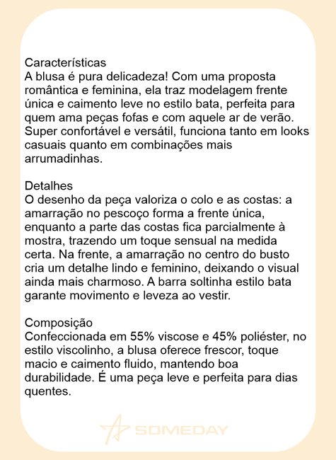 A blusa é pura delicadeza! Com uma proposta romântica e feminina, ela traz modelagem frente única e caimento leve no estilo bata, perfeita para quem ama peças fofas e com aquele ar de verão. Super confortável e versátil, funciona tanto em looks casuais quanto em combinações mais arrumadinhas.