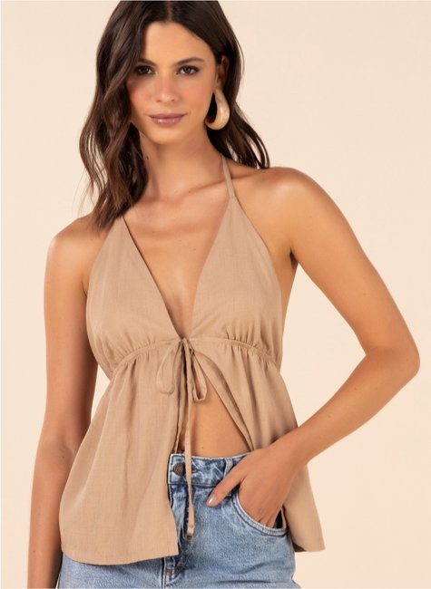 O desenho da peça valoriza o colo e as costas: a amarração no pescoço forma a frente única, enquanto a parte das costas fica parcialmente à mostra, trazendo um toque sensual na medida certa. Na frente, a amarração no centro do busto cria um detalhe lindo e feminino, deixando o visual ainda mais charmoso. A barra soltinha estilo bata garante movimento e leveza ao vestir.