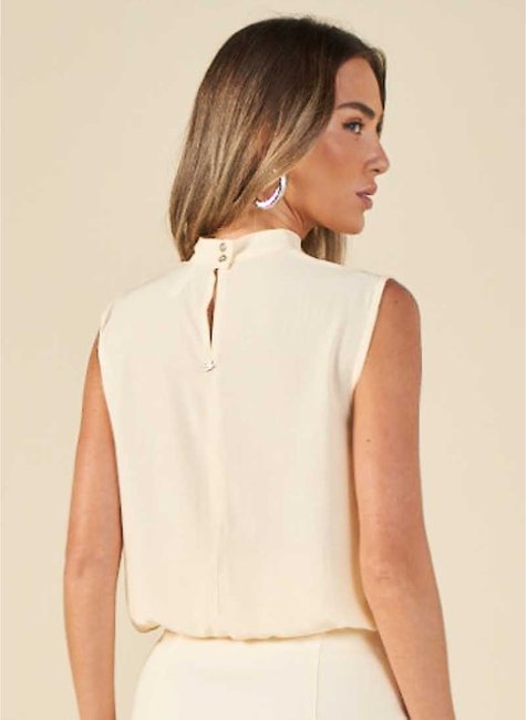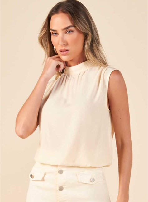 Delicada e sofisticada, esta blusa sem mangas é ideal para quem busca leveza e elegância em uma única peça. A gola alta confere um toque moderno e refinado ao visual, enquanto o recorte sem mangas valoriza os ombros de maneira sutil e feminina. Perfeita para produções versáteis — do trabalho ao lazer — com estilo e conforto.
