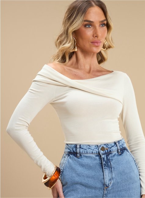O destaque fica para o decote assimétrico com efeito transpassado, que valoriza o colo e adiciona personalidade ao look. As mangas longas equilibram o design, enquanto a malha garante conforto e flexibilidade, tornando a peça versátil para diferentes ocasiões.