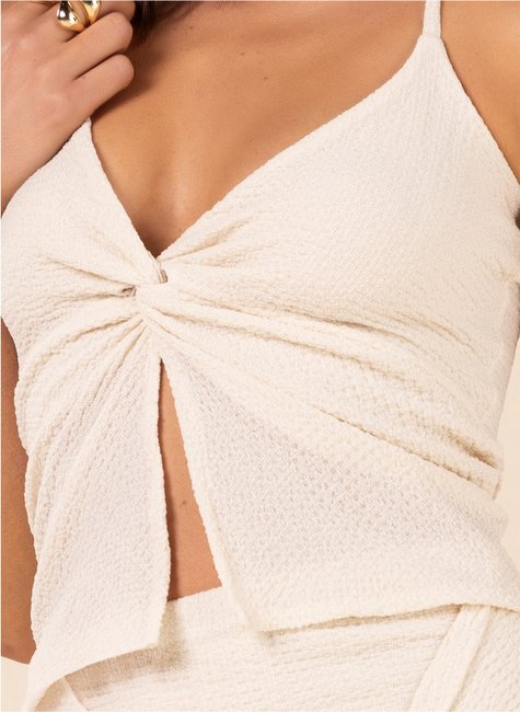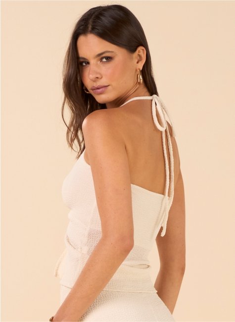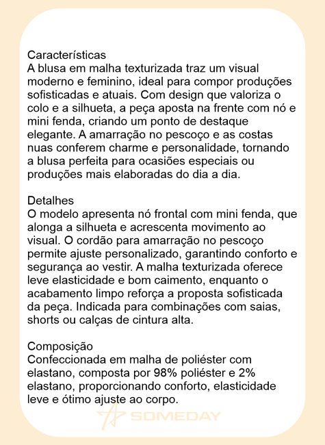 O modelo apresenta nó frontal com mini fenda, que alonga a silhueta e acrescenta movimento ao visual. O cordão para amarração no pescoço permite ajuste personalizado, garantindo conforto e segurança ao vestir. A malha texturizada oferece leve elasticidade e bom caimento, enquanto o acabamento limpo reforça a proposta sofisticada da peça. Indicada para combinações com saias, shorts ou calças de cintura alta.