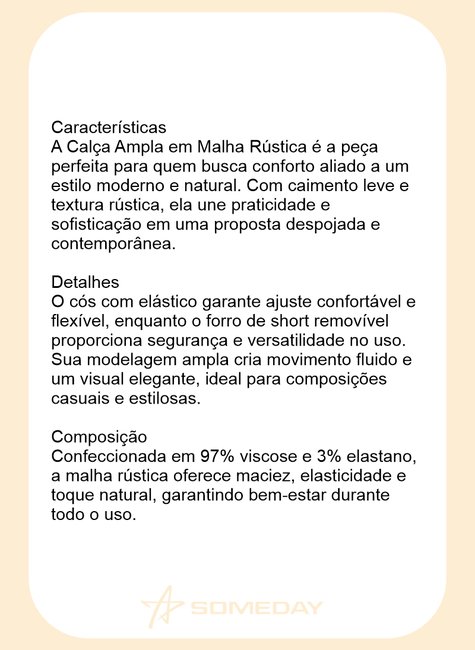 A Calça Ampla em Malha Rústica é a peça perfeita para quem busca conforto aliado a um estilo moderno e natural. Com caimento leve e textura rústica, ela une praticidade e sofisticação em uma proposta despojada e contemporânea.