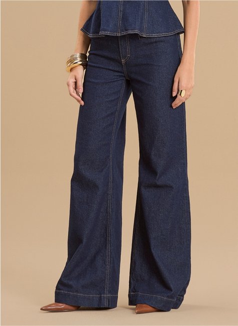 Possui bolsos frontais embutidos que mantêm o visual mais clean e alinhado. O destaque fica para a modelagem wide leg com pernas amplas e barra larga, além das costuras frontais aparentes que ajudam a alongar visualmente a silhueta. A lavagem escura reforça a versatilidade, permitindo produções que vão do casual ao mais refinado.