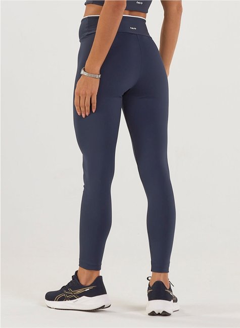 Calça legging com friso branco no cós, malha dupla, zero transparência e compressão confortável. Toque macio e proteção UV 80+, mesmo esticada ou molhada.