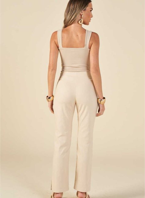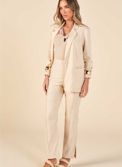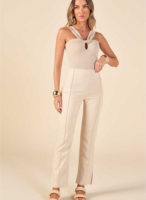 Elegante e moderna na medida certa, esta calça de linho com abertura na barra e friso frontal é a escolha perfeita para elevar qualquer produção.