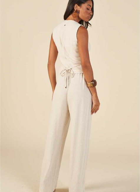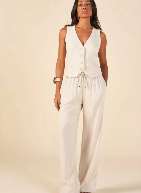 A calça de linho com elástico na cintura combina conforto e sofisticação em uma única peça.
