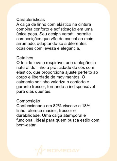 O tecido leve e respirável une a elegância natural do linho à praticidade do cós com elástico, que proporciona ajuste perfeito ao corpo e liberdade de movimentos. O caimento soltinho valoriza o conforto e garante frescor, tornando-a indispensável para dias quentes.