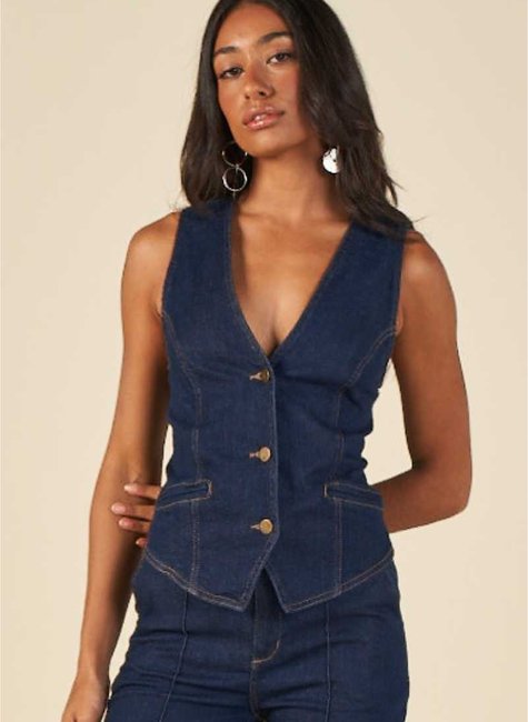 Colete jeans com modelagem inspirada na alfaiataria, que une o estilo casual do denim à sofisticação das peças estruturadas.
