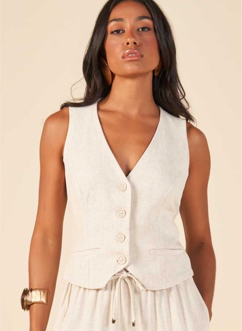 O colete em linho com ajustes nas costas é a peça-chave para criar produções elegantes e modernas com leveza.