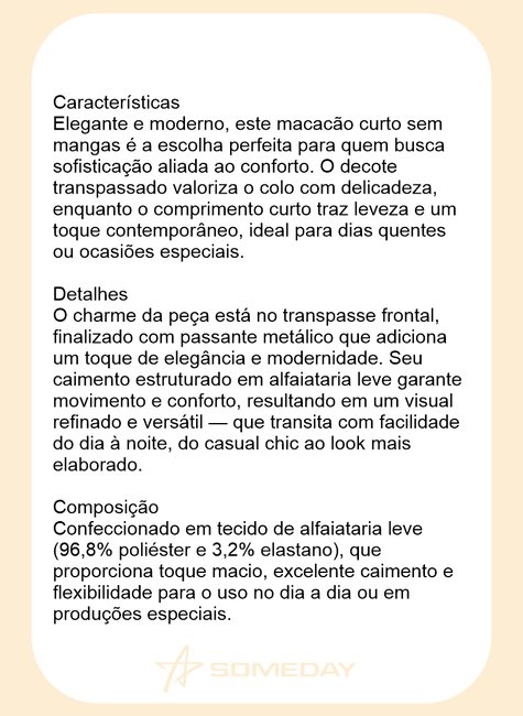 Elegante e moderno, este macacão curto sem mangas é a escolha perfeita para quem busca sofisticação aliada ao conforto. O decote transpassado valoriza o colo com delicadeza, enquanto o comprimento curto traz leveza e um toque contemporâneo, ideal para dias quentes ou ocasiões especiais.