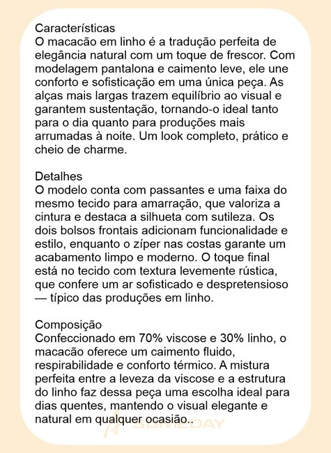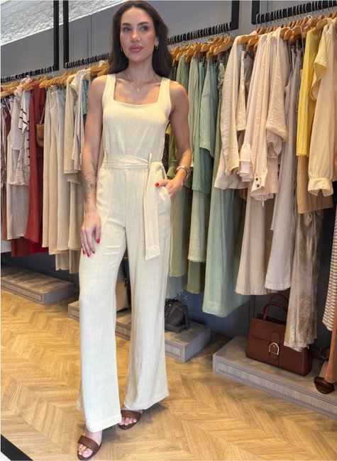 O macacão em linho é a tradução perfeita de elegância natural com um toque de frescor. Com modelagem pantalona e caimento leve, ele une conforto e sofisticação em uma única peça. As alças mais largas trazem equilíbrio ao visual e garantem sustentação, tornando-o ideal tanto para o dia quanto para produções mais arrumadas à noite. Um look completo, prático e cheio de charme.