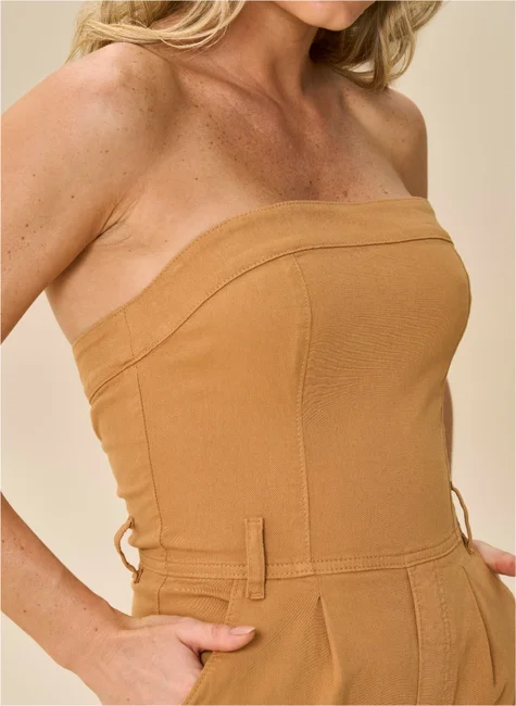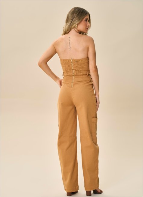 O modelo possui bolsos tipo cargo, que adicionam um toque utilitário e funcional ao design. As costas contam com lastex para melhor ajuste ao corpo, além de fechamento em zíper que facilita o vestir. O decote tomara que caia valoriza o colo e traz um ar contemporâneo à peça.