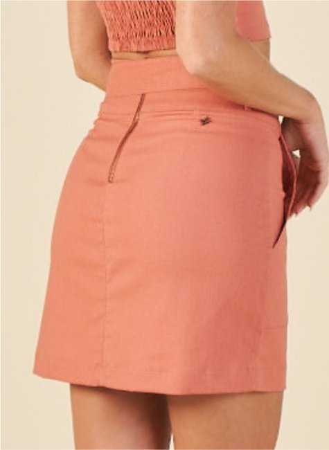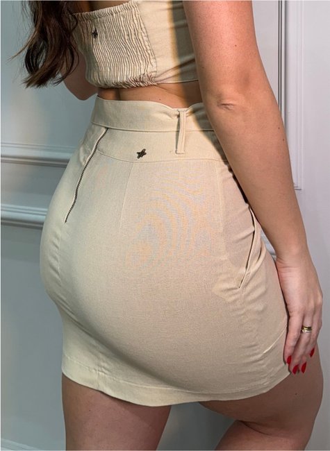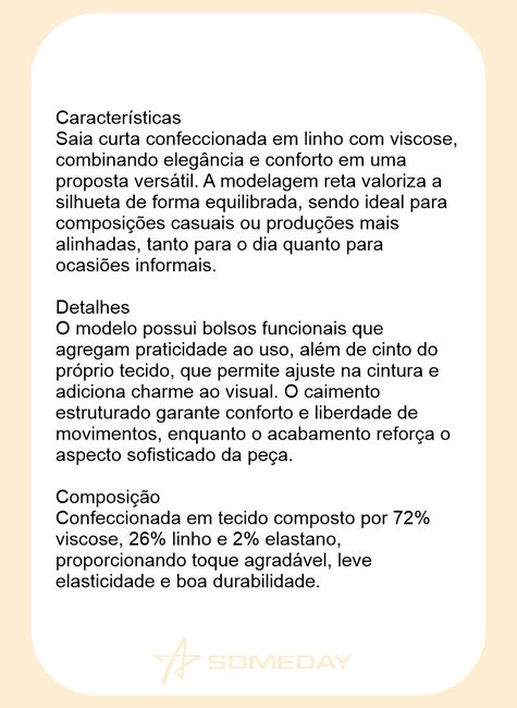Saia curta confeccionada em linho com viscose, combinando elegância e conforto em uma proposta versátil.
