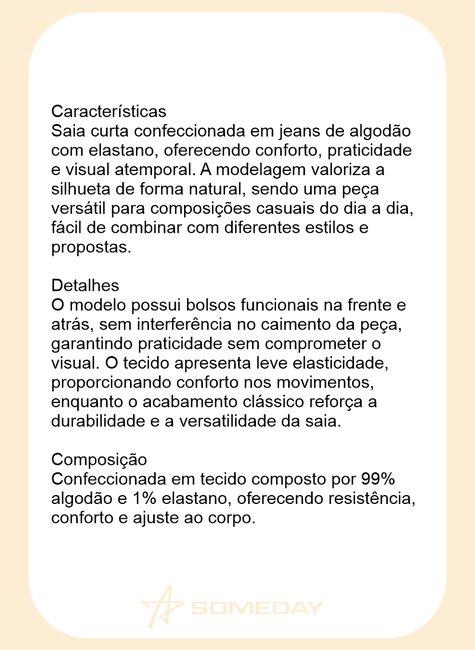 Saia curta confeccionada em jeans de algodão com elastano, oferecendo conforto, praticidade e visual atemporal. A modelagem valoriza a silhueta de forma natural, sendo uma peça versátil para composições casuais do dia a dia, fácil de combinar com diferentes estilos e propostas.