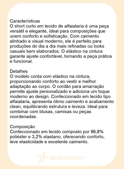 O short curto em tecido de alfaiataria é uma peça versátil e elegante, ideal para composições que unem conforto e sofisticação. Com caimento alinhado e visual moderno, ele é perfeito para produções do dia a dia mais refinadas ou looks casuais bem elaborados. O elástico na cintura garante ajuste confortável, tornando a peça prática e funcional.