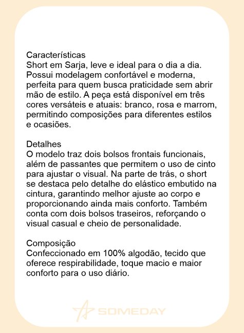 Short em Sarja, leve e ideal para o dia a dia. Possui modelagem confortável e moderna, perfeita para quem busca praticidade sem abrir mão de estilo. A peça está disponível em três cores versáteis e atuais: branco, rosa e marrom, permitindo composições para diferentes estilos e ocasiões.