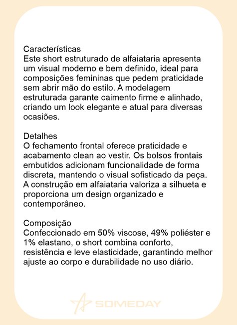 Este short estruturado de alfaiataria apresenta um visual moderno e bem definido, ideal para composições femininas que pedem praticidade sem abrir mão do estilo. A modelagem estruturada garante caimento firme e alinhado, criando um look elegante e atual para diversas ocasiões.