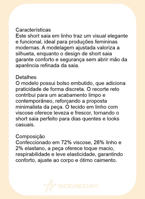 O modelo possui bolso embutido, que adiciona praticidade de forma discreta. O recorte reto contribui para um acabamento limpo e contemporâneo, reforçando a proposta minimalista da peça. O tecido em linho com viscose oferece leveza e frescor, tornando o short saia perfeito para dias quentes e looks casuais.
