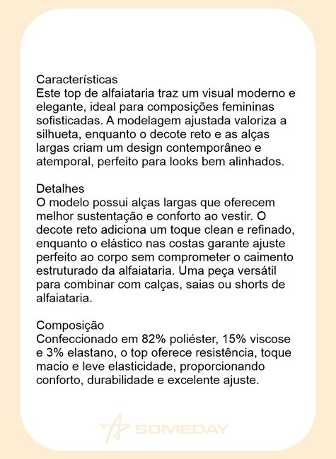 O modelo possui alças largas que oferecem melhor sustentação e conforto ao vestir. O decote reto adiciona um toque clean e refinado, enquanto o elástico nas costas garante ajuste perfeito ao corpo sem comprometer o caimento estruturado da alfaiataria. Uma peça versátil para combinar com calças, saias ou shorts de alfaiataria.