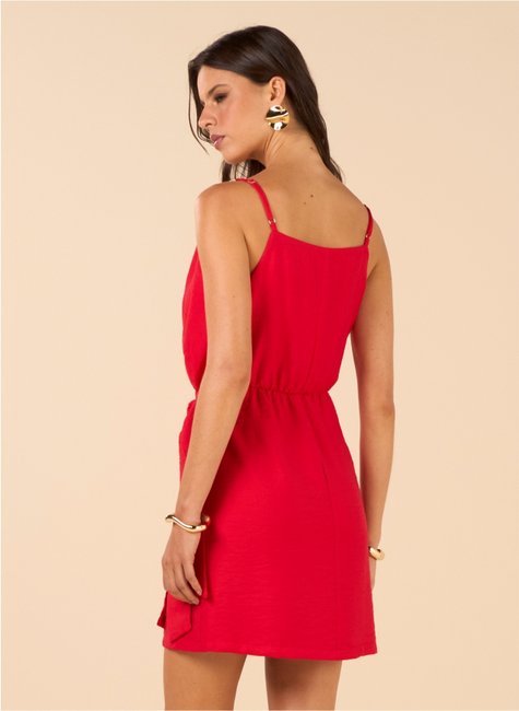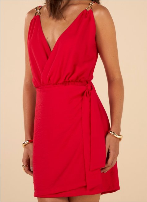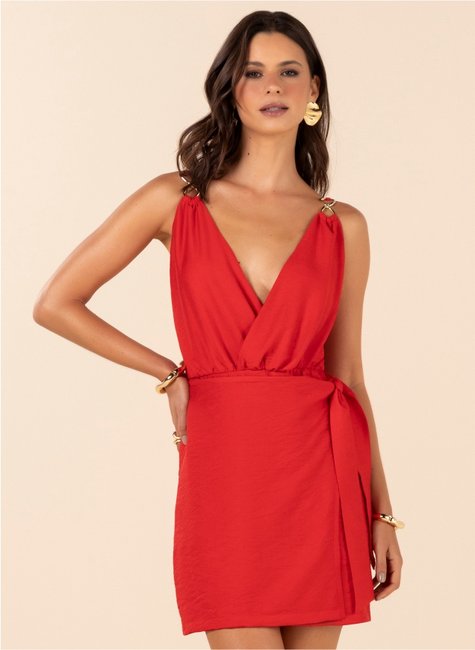 O modelo conta com alças ajustáveis, proporcionando melhor adaptação ao corpo e mais conforto no uso. O destaque fica por conta do aviamento aplicado nas alças, que agrega sofisticação e diferencial ao design. O decote em V alonga visualmente a silhueta, enquanto a saia com transpasse frontal confere movimento e charme à peça.