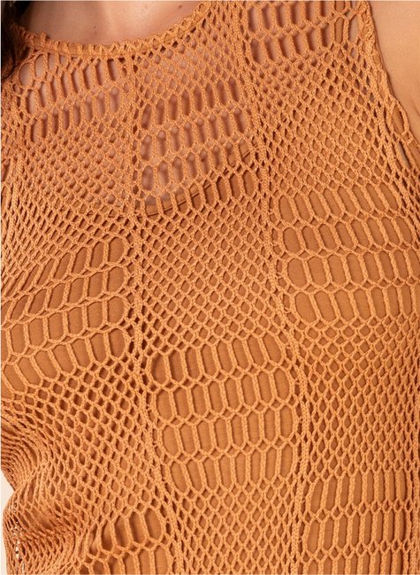O tecido em tela de malha possui textura diferenciada, que agrega valor visual e personalidade ao modelo. O caimento acompanha o corpo sem limitar os movimentos, proporcionando conforto durante o uso. O design sem mangas reforça a versatilidade da peça, permitindo composições tanto com sandálias quanto com calçados mais estruturados.