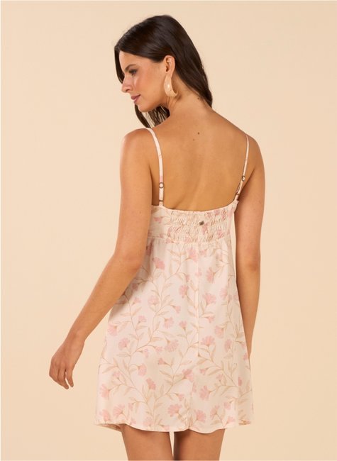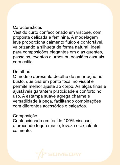 O modelo apresenta detalhe de amarração no busto, que cria um ponto focal no visual e permite melhor ajuste ao corpo. As alças finas e ajustáveis garantem praticidade e conforto no uso. A estampa suave agrega charme e versatilidade à peça, facilitando combinações com diferentes acessórios e calçados.