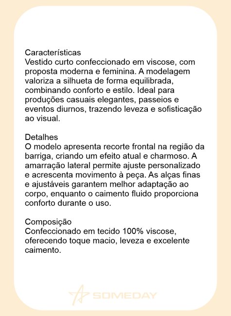 Vestido curto confeccionado em viscose, com proposta moderna e feminina. A modelagem valoriza a silhueta de forma equilibrada, combinando conforto e estilo. Ideal para produções casuais elegantes, passeios e eventos diurnos, trazendo leveza e sofisticação ao visual.