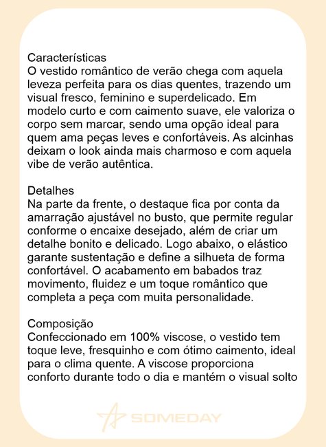 O vestido romântico de verão chega com aquela leveza perfeita para os dias quentes, trazendo um visual fresco, feminino e superdelicado. Em modelo curto e com caimento suave, ele valoriza o corpo sem marcar, sendo uma opção ideal para quem ama peças leves e confortáveis. As alcinhas deixam o look ainda mais charmoso e com aquela vibe de verão autêntica.