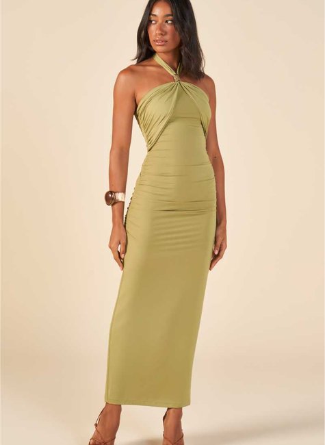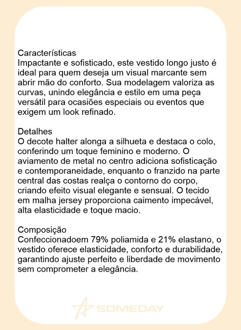 O decote halter alonga a silhueta e destaca o colo, conferindo um toque feminino e moderno. O aviamento de metal no centro adiciona sofisticação e contemporaneidade, enquanto o franzido na parte central das costas realça o contorno do corpo, criando efeito visual elegante e sensual. O tecido em malha jersey proporciona caimento impecável, alta elasticidade e toque macio.