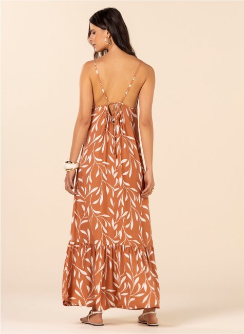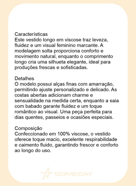 O modelo possui alças finas com amarração, permitindo ajuste personalizado e delicado. As costas abertas adicionam charme e sensualidade na medida certa, enquanto a saia com babado garante fluidez e um toque romântico ao visual. Uma peça perfeita para dias quentes, passeios e ocasiões especiais.