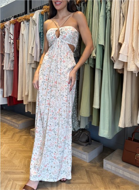 O destaque fica por conta do decote trançado com cordão rústico ajustável, que adiciona um toque artesanal e autêntico à peça. Os recortes laterais criam uma leve sensualidade e realçam o corpo de forma sutil, enquanto as costas parcialmente nuas equilibram frescor e elegância. Uma peça versátil e encantadora, perfeita para ocasiões de verão — do pôr do sol na praia a eventos ao ar livre.