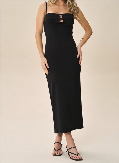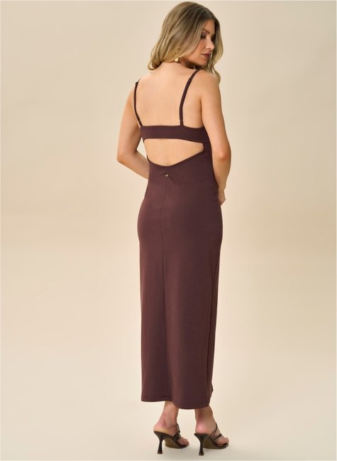As alças finas reguláveis permitem melhor ajuste ao corpo, enquanto as costas abertas criam um visual marcante e contemporâneo. A modelagem de linhas retas acompanha o corpo de forma harmoniosa, garantindo caimento confortável e acabamento refinado.