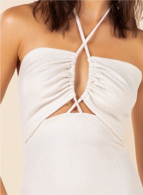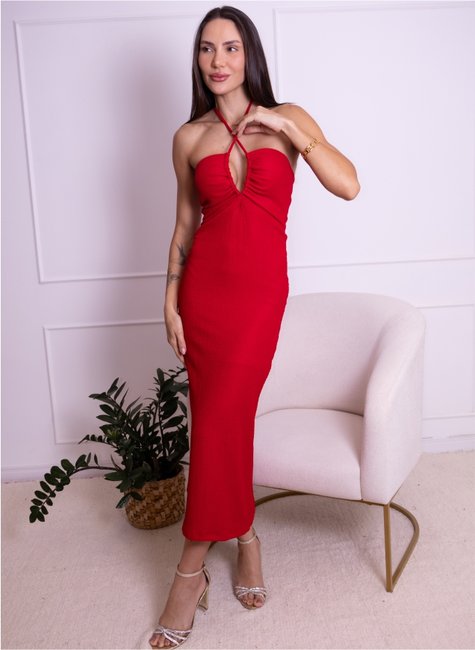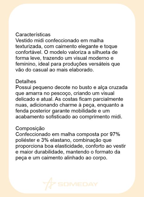 Possui pequeno decote no busto e alça cruzada que amarra no pescoço, criando um visual delicado e atual. As costas ficam parcialmente nuas, adicionando charme à peça, enquanto a fenda posterior garante mobilidade e um acabamento sofisticado ao comprimento midi.