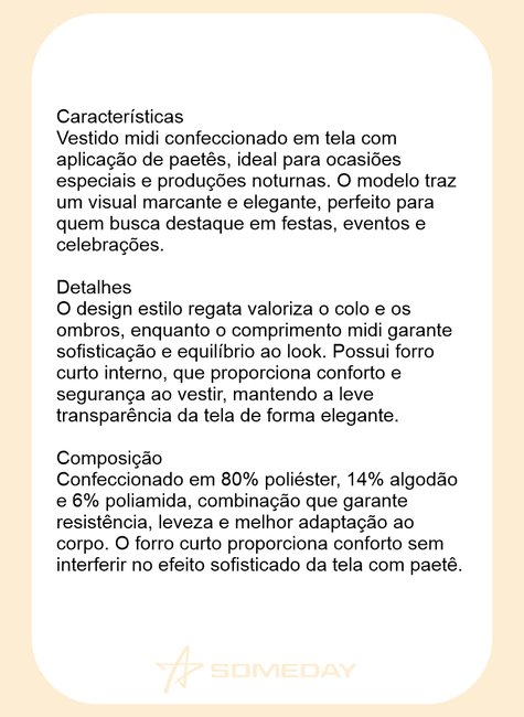 Vestido midi confeccionado em tela com aplicação de paetês, ideal para ocasiões especiais e produções noturnas. O modelo traz um visual marcante e elegante, perfeito para quem busca destaque em festas, eventos e celebrações.