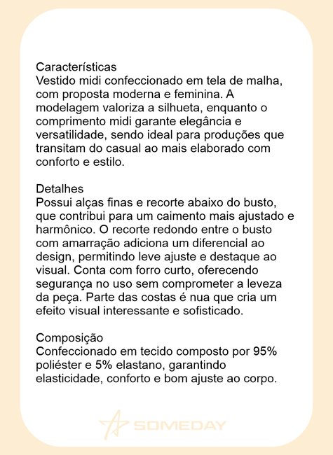 Vestido midi confeccionado em tela de malha, com proposta moderna e feminina. A modelagem valoriza a silhueta, enquanto o comprimento midi garante elegância e versatilidade, sendo ideal para produções que transitam do casual ao mais elaborado com conforto e estilo.
