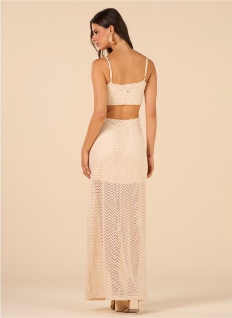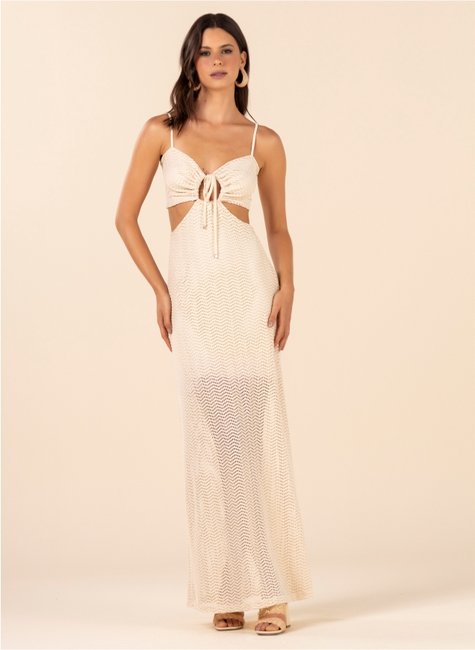 Possui alças finas e recorte abaixo do busto, que contribui para um caimento mais ajustado e harmônico. O recorte redondo entre o busto com amarração adiciona um diferencial ao design, permitindo leve ajuste e destaque ao visual. Conta com forro curto, oferecendo segurança no uso sem comprometer a leveza da peça. Parte das costas é nua que cria um efeito visual interessante e sofisticado.