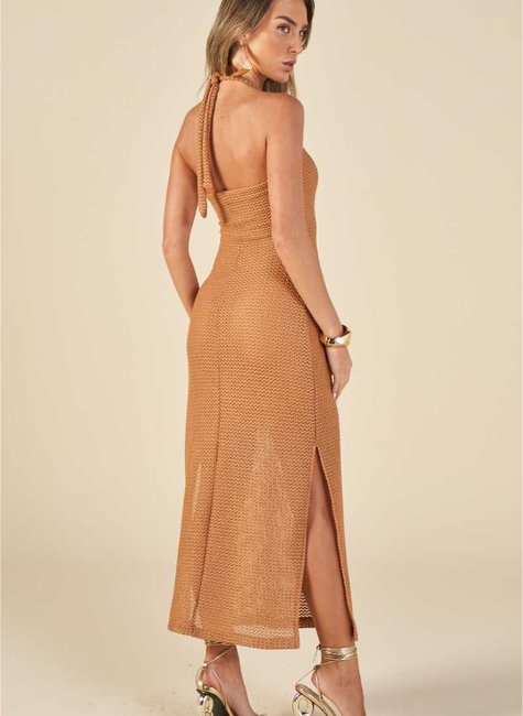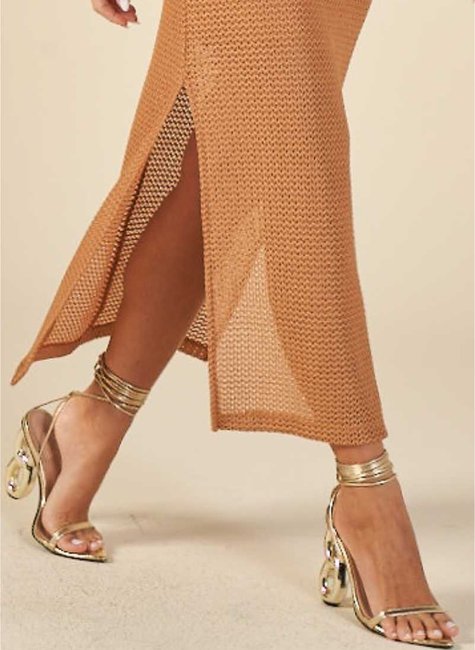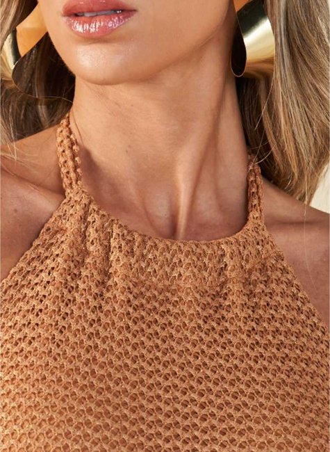 Com modelagem frente única e decote halter que amarra no pescoço, o vestido destaca o colo e os ombros, criando um efeito feminino e alongado. O tecido tipo tela com brilho sutil garante um visual moderno e levemente transparente na medida certa, equilibrado pelo forro curto interno que traz conforto e segurança. A fenda lateral completa o look com movimento e um toque sensual delicado — perfeito para produções de verão e ocasiões especiais.