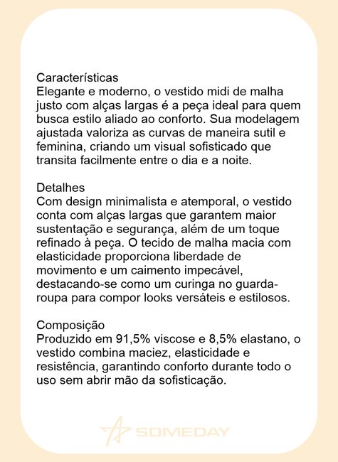 Elegante e moderno, o vestido midi de malha justo com alças largas é a peça ideal para quem busca estilo aliado ao conforto. Sua modelagem ajustada valoriza as curvas de maneira sutil e feminina, criando um visual sofisticado que transita facilmente entre o dia e a noite.
