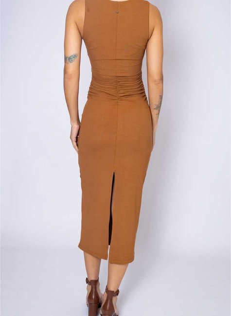 Produzido em 91,5% viscose e 8,5% elastano, o vestido combina maciez, elasticidade e resistência, garantindo conforto durante todo o uso sem abrir mão da sofisticação.