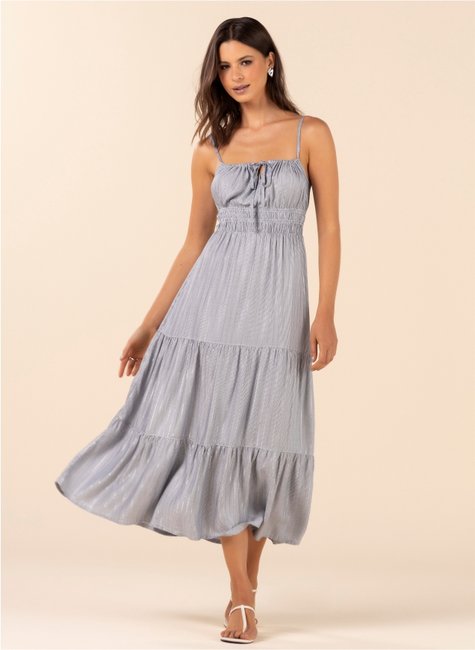 Romântico e cheio de movimento, este vestido midi em viscose traz leveza e feminilidade em cada detalhe. Confeccionado no mesmo tecido da blusa e da saia coordenada, ele possui fios de brilho em lurex que iluminam o visual de forma suave, garantindo um toque elegante sem perder a delicadeza. Com caimento fluido, é a peça perfeita para compor looks charmosos para o dia ou para ocasiões especiais.