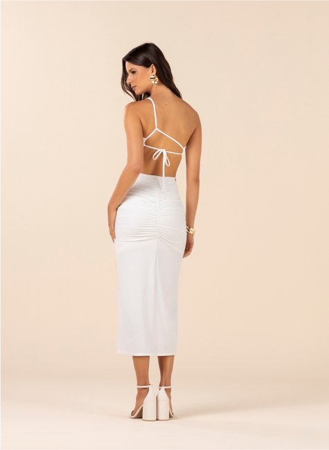 Possui modelagem ajustada com recortes laterais que destacam a cintura, além de franzido central frontal que contribui para melhor caimento e valorização das curvas. A fenda frontal acrescenta movimento e sensualidade na medida certa. Confeccionado em tecido com elasticidade, garante conforto, liberdade de movimentos e acabamento refinado.