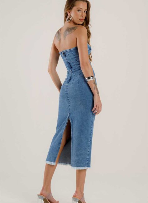 O vestido jeans midi tomara que caia é uma peça super versátil que pode ser adaptada para várias ocasiões. Sua combinação de tecido durável com o corte moderno e o detalhe tomara que caia cria um look feminino, confortável e cheio de estilo. Seja para um passeio informal ou uma saída mais sofisticada, ele é uma excelente escolha para quem busca praticidade sem abrir mão da elegância.
